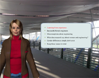 These models were created at the Center for Research and Innovative Technologies for Learning (RITL) group directed by Dr. Amy L. Baylor. My role was the leader of the development team. In a line of studies we examined the prospect of changing middle-school and undergraduates students' attitudes towards careers in engineering using computer-based social models (3-D interface agents). In particular, we examined the influence of the agent characteristics (e.g., gender, race, age, cool or not), its presence (e.g., agent vs. voice only), and its message. Click on the picture to get a full list of studies with links to the agents models.