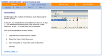 In the topic-centered condition, on the other hand, no tasks were presented to the learners up front. Instead, objectives were presented to the learners at the beginning of each topic section (timeline, dynamic texts, and buttons). Thus, in the topic-centered condition, each of the three steps (topics) referred to only one of the topics, for example, in step one, the learners learned only about timeline effects. It is important to note that while the order and the context of the instruction were different, the content (e.g., how to create a button) was identical for both conditions.